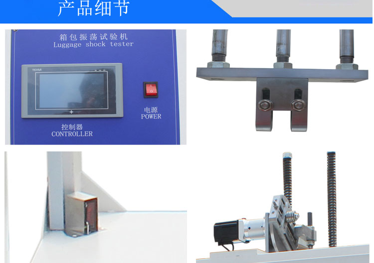 本機(jī)臺(tái)用于測試旅行箱提把、車縫線及整體結(jié)構(gòu)的耐震蕩沖擊試驗(yàn).方法是在對象上裝載規(guī)定的荷重,以每分鐘30次的速度沖擊及4英寸的沖程對試件做2500次試驗(yàn),試驗(yàn)結(jié)果可作為質(zhì)量改進(jìn)的參考.