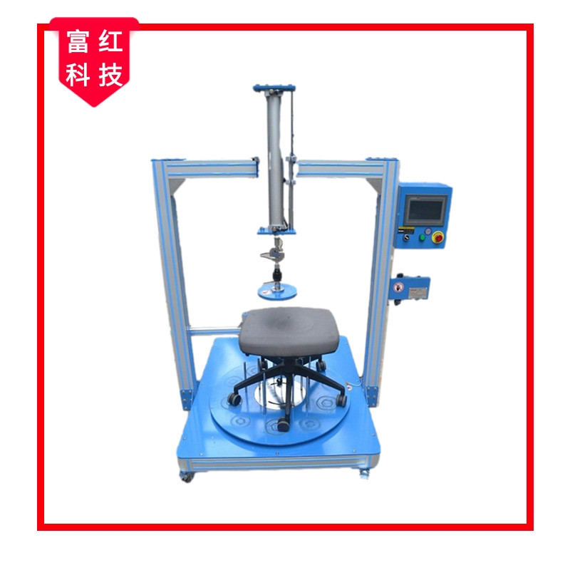 試驗機用于評估辦公椅腳輪軸之質(zhì)量及磨耗壽命。辦公椅座面放置負荷,施力循環(huán)裝置,作循環(huán)旋轉(zhuǎn)動作,行程及時間、次數(shù)均可設定。
